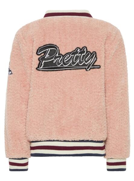 Chaqueta Name It. Modelo Melody. Color Rosa. Corte Bomber. Tejido de borreguillo. Cierrre con cremallera. Parches bordados en el pecho. 2 bolsillos. Elastico en punos y bajo.