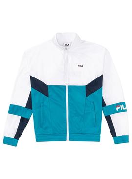 Chaqueta Fila. Modelo Talen. Cierre con cremallera. Color blanco y turquesa. Logo en el pecho. Fila Grande en la espalda. Logo en una manga. Estampado con bloques de color. Bolsillos laterales con cremallera. Cuello alto. Regular fit. El modelo lleva la M.