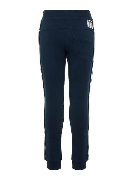 Pantalón de chándal Name It. Modelo Honk. Color marino. Cintura ajustable con cordón. Cinta a rayas decorativa en laterales. Bolsillos con cremallera. Interior afelpado.