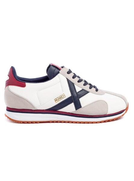 Zapatillas Munuch. Modelo Sapporo 93. Color blanco. Detalles en rojo y azul marino. Paneles de ante gris. Cierre con cordones. Suela de goma. Entresuela blanca. Logo lateral.