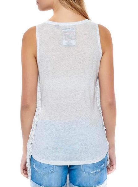 Camiseta Superdry. Modelo Side. Color beige. Sin mangas. Flecos en los laterales. Estampado en la parte delantera. Etiqueta de la marca en el bajo. Regular fit. Tejido ligero. La modelo lleva la talla S.