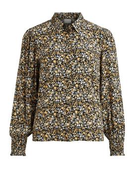 Camisa Vila. Modelo Vitendi. Estampado de flores. Color negro, amarillo y azul claro. Cierre con botones forrados. Manga larga. Puños elásticos. Bajo elástico. La modelo lleva una talla 38