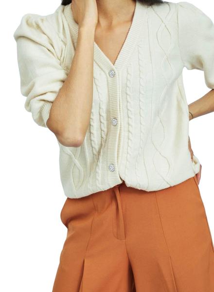 Chaqueta corta Vila. Modelo Vibecks. Modelo Beige. Cierre con botones. Cuello, puños y bajo acanalado. Cuello en V. La modelo lleva la talla 38.