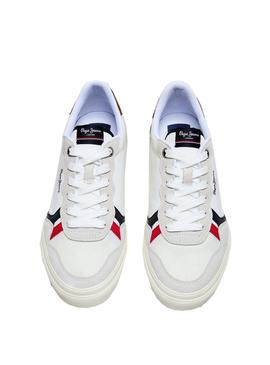 Zapatillas Pepe Jeans. Modelo Kenton Britt. Color blanco. Suela de goma. Cierre con cordones. Detalles en azul marino y rojo. Logo en el lado estampado. Paneles de ante.