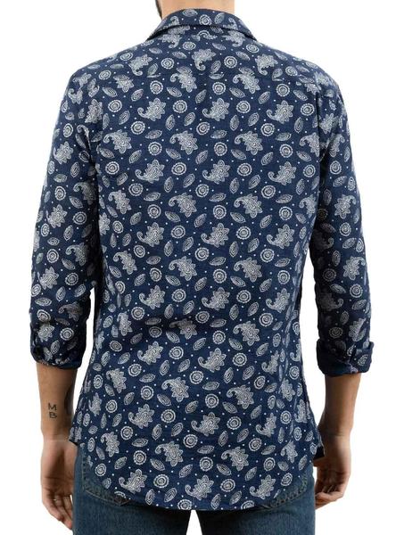 Camisa Klout. Estampado paisley y lunares. Color azul marino y blanco. Cierre con botones. Bajo redondeado. Regular fit. Puños ajustados con botones. Logo blanco bordado en el pecho. El modelo lleva la talla M.