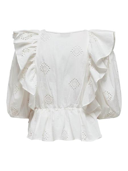 Camisa Only. Modelo Irma. Color blanco. Detalles canalados. Volantes en mangas y cintura. Cuello en V. Manga corta. La modelo lleva la talla S.