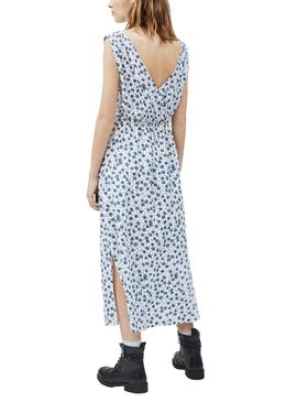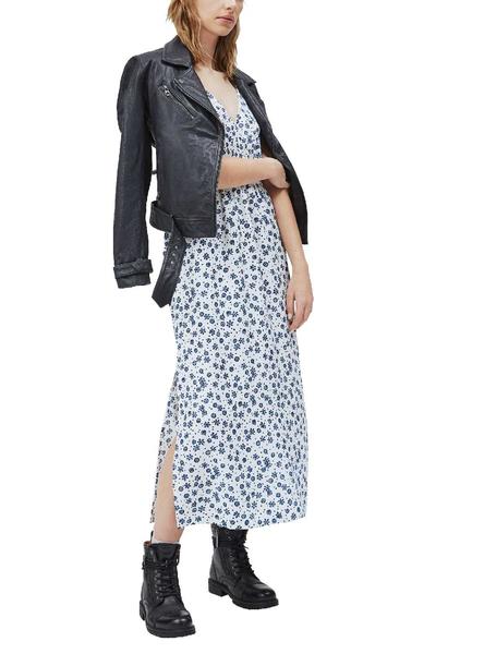 Vestido Pepe Jeans. Modelo Lou. Estampado de flores. Color azul marino y blanco. Escote en V en pecho y espalda. Aberturas en los lados. Cintura elástica. La modelo lleva la talla S.