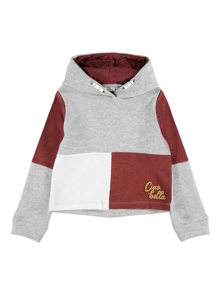 Sudadera Name It. Modelo Flaspain. Color gris, granate y blanco. Estilo bloque de color. Extremos de mangas elasticos. Ajuste holgado. Mensaje bordado en el bajo en tono ocre.