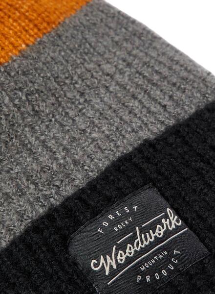 Gorro Name It. Modelo Moss. Color naranja, gris y azul marino. Patron a rayas. Tejido acanalado. Bajo con vuelta. Etiqueta de la marca en la parte delantera.