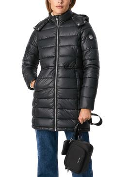 Chaqueta Pepe Jeans. Modelo Eileen. Color negro. Cuello alto con capucha desmontable. Cierre con cremallera. Bolsillos laterales. Tejido acolchado. Cintura ajustable con cordon. Bolsillo interior.