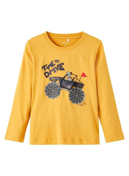 Camiseta Name It. Color amarillo. Manga larga. Terminaciones acanaladas. Estampado en el pecho. Cuello redondo. Tejido de algodón orgánico. Formato regular.