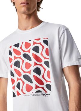 Camiseta Pepe Jeans. Modelo Agin. Color blanco. Manga corta. Cuello redondo. Logo en la manga. Estampado abstracto en el pecho en color rojo y marino.