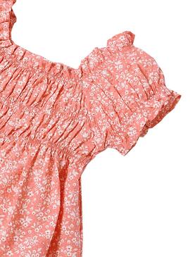 Blusa Mayoral. Modelo Seersucker. Estampado floral de color rosa y blanco. Manga corta. Detalles de voltantes y tejido plisado en la parte superior.