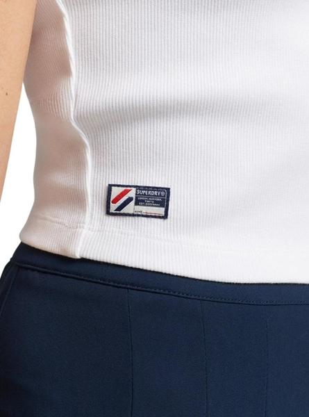 Camiseta Superdry. Modelo Code Essential. Color blanco. Tirantes finos. Logo bordado en el pecho. Etiqueta cosida en la parte inferior. Tejido acanalado elástico.