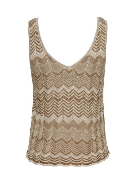 Top Only. Modelo Lanica. Estampado geométrico en tonos beiges. Tirantes anchos. Escote en V frontal y trasero. Sin mangas.