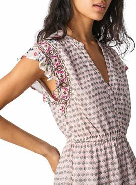 Vestido Pepe Jeans. Modelo Mercer. Estampado multicolor combinado. Cuello redondo con abertura en V. Manga sisa con volantes decorativos. Detalles bordados. Tejido fluido. Cierre frontal abotonado. Cintura ajustable con cordón.