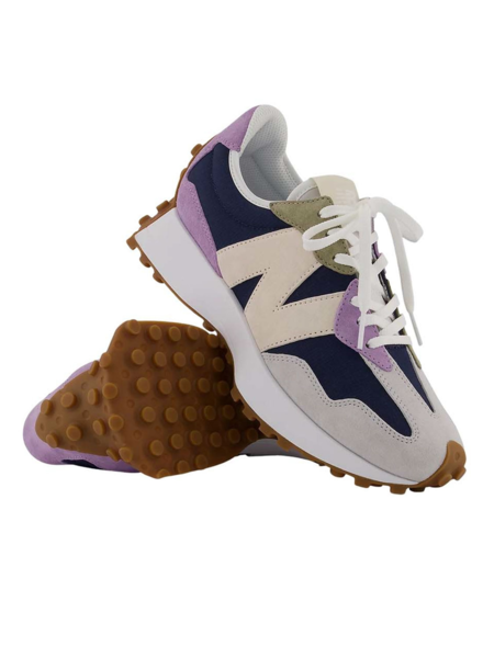 Zapatillas New Balance. Colores azul, malva, verde y crema. Modelo 327. Suela marrón y entresuela en crema. Talón de goma. Cierre con cordones.
