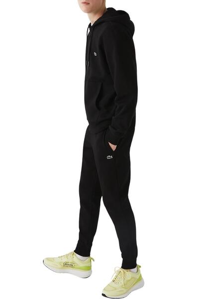 Chándal Lacoste. Modelo WH2528. Color negro. Chaqueta con cremallera y capucha. Logo bordado en el pecho. Pantalón con logo bordado y bolsillos laterales.