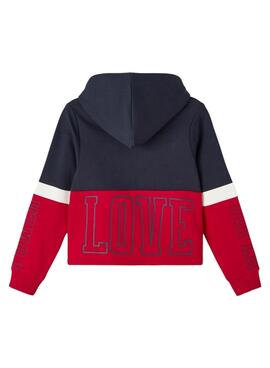 Sudadera Name It. Modelo FLikka. Color rojo, blanco y marino. Con capucha sin cordones. Puños y bajo elásticos. Estampado con mensaje. en el frontal, en la manga y en la parte trasera. Crop. Corte regular fit.