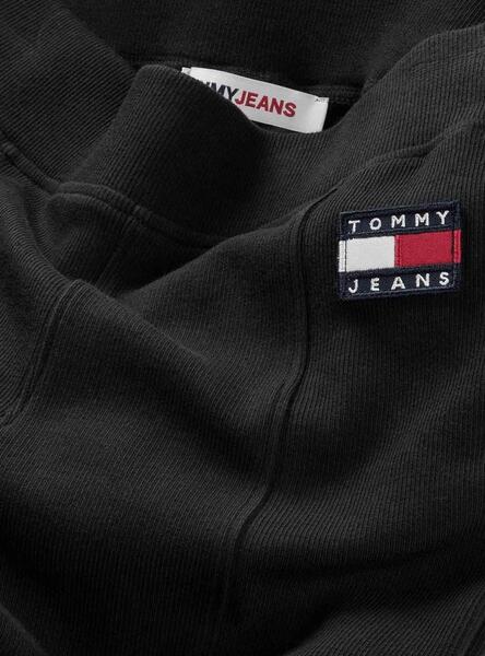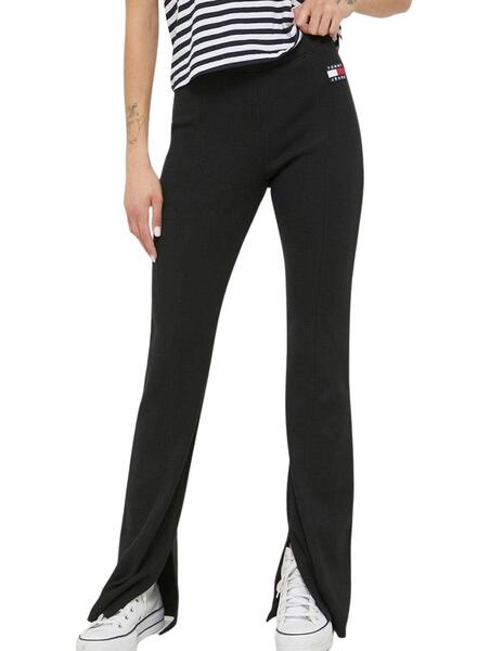 Pantalón Tommy Jeans. Diseño Flare. Tejido acanalado y elástico. Color negro. Bandera pequeña en la cadera. Cinturilla elástica.