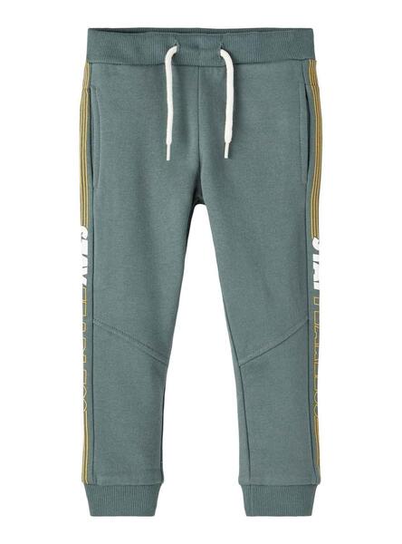 Pantalón de Chándal Name It para niño. Bandas a contraste en la pierna con mensaje. Color verde. Cordón en la cintura. Bolsillos laterales. Puños en el bajo. Cinturilla elástica ajustable. Bolsillo trasero.