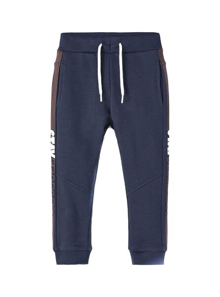 Pantalón de Chándal Name It. Corte Regular fit. Modelo Vamilton. Color marino. Bandas laterales. Detalles en blanco. Puños elásticos. Cinturilla con cordón y goma. Bolsillos lateraes.