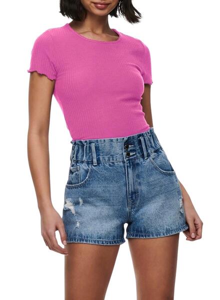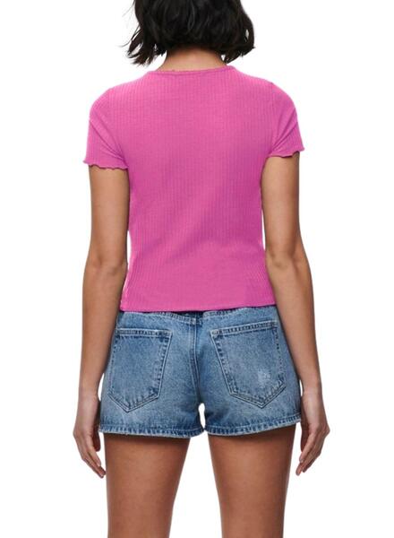 Camiseta corta Only. Modelo Emma. Color rosa. Manga corta. Volantes en las terminaciones. Cuello redondo. Tejido acanalado. La modelo lleva la talla S.