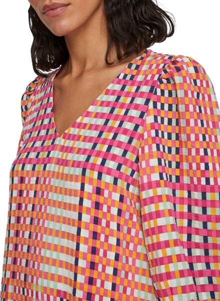 Vestido midi Vila. Modelo Pipa. Estampado a cuadros. Mangas 3/4 abullonadas. Cuello en V. La modelo lleva la talla 38.