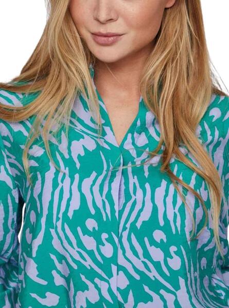 Camisa Vila. Modelo Dogma Jade. Color Verde y morado. Tejido fluido y ligero. Manga larga. Mangas abullonadas. Cierre con botones invisibles. Puños ajustables.