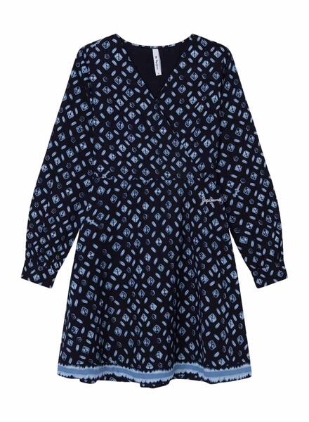 El vestido de la marca PEPE JEANS Kids para niña es la elección perfecta para añadir un toque de estilo y comodidad al guardarropa de las más pequeñas. Confeccionado en un tejido suave y ligero, este vestido presenta un atractivo estampado geométrico en tonos oscuros con detalles en azul claro, que aportan un aire moderno y fresco. Su diseño de mangas largas lo hace ideal para cualquier estación, ofreciendo versatilidad y protección en los días más frescos. El corte en la cintura resalta la silueta de manera sutil, mientras que la falda fluida brinda libertad de movimiento para las actividades diarias. Además, el detalle de encaje en el borde inferior añade un toque femenino y delicado. Perfecto para ocasiones casuales o formales, este vestido combina fácilmente con chaquetas o cardigans, permitiendo crear múltiples looks. Una prenda esencial que combina estilo y funcionalidad.