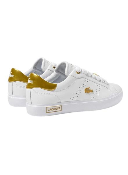 Zapatillas Lacoste. Modelo Powercourt 2.0. Color blanco. Detalles en dorado. Cierre do cordones. Empeine de piel. Detalles distintivos de lacoste. Diseño vulcanizado. Forro de tela.