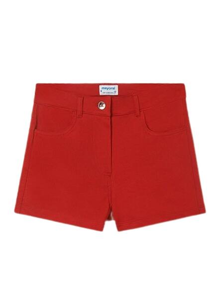 Pantalón corto para niña Mayoral. Color rojo. Cierre con botón y cremallera. Bolsillos laterales. Trabillas para cinturón. Tejido elástico.