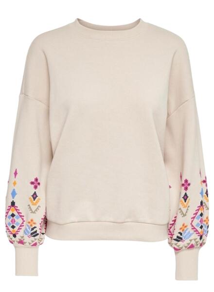 Sudadera Only. Modelo Emily. Color beige. Cuello redondo. Estampado étnico en mangas. Manga larga.