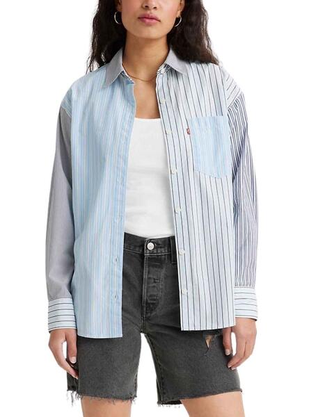 Camisa Levis. Color azul. Estampado de listas. Con bloques de color. Corte extragrande. Bolsillo en el pecho. Manga larga. Cierre delantero con botones. Etiqueta roja en el bolsillo. La modelo lleva la talla S.