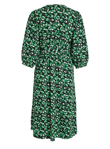 Vestido Vila. Modelo vimeda. Estampado en color verde, negro y blanco. Mangas abullonadas. Cintura ajustable con cinturón. Escote en V.