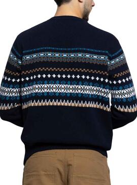 Jersey Klout. Color azul marino. Tejido con estampado de Yacar. Extremos acanalados. Parche de la marca en el bajo. Fabricado en Galicia.