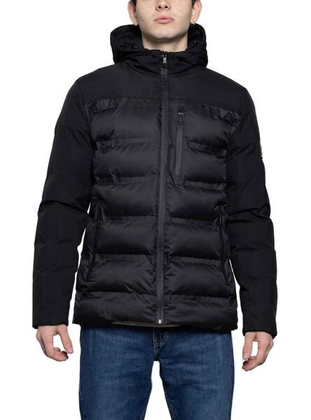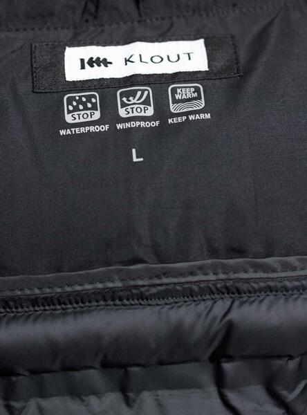 Cazadora Klout. Modelo Tahume. Diseño acolchado. Color negro. Cierre con cremalleras estancas. Bolsillos exteriores e interiores. Cuello alto. Con capucha. Fabricada en España. Resistente al agua y al viento.