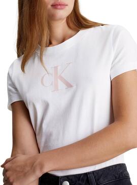 Camiseta Calvin Klein. Modelo Satin. Corte slim fit. Color blanco. Logo estampado en el pecho. Manga corta. Cuello redondo elástico. La modelo lleva la talla S.