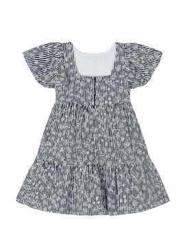 Vestido Mayoral. Modelo Popelín. Color marino. Mangas cortas con volantes. Estampado en toda la pieza. Cuello redondo.
