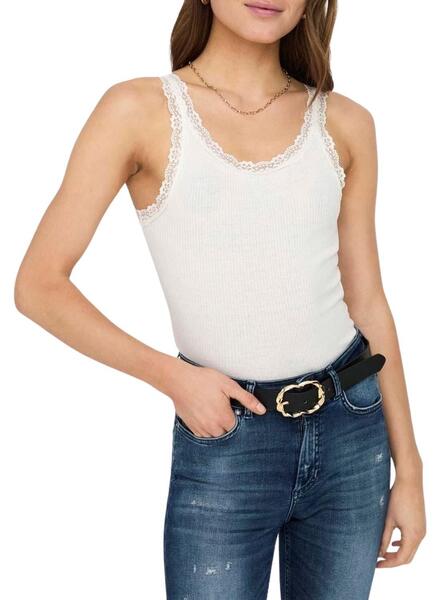 Camiseta Only. Modelo Sharai. Color blanco. Cuello redondo. Extremos con puntilla de encaje. Corte ajustado. Tejido acanalado.