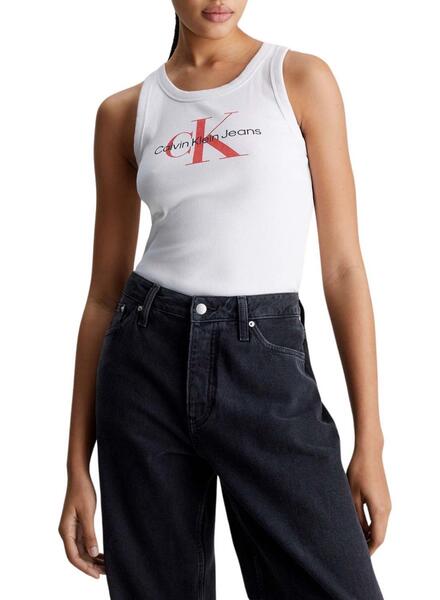 Camiseta Calvin Klein. Modelo Archival Monologo. Color blanco. Sin mangas. Logo estampado en el pecho. Tejido de punto elástico. Testura de canalé. Sin cierres. Ajustado al cuerpo. La modelo lleva la talla S.
