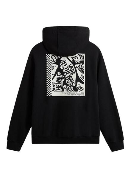 Sudadera Vans. Color negro. Modelo Box. Capucha con cordon. Bolsillo canguro. Etiqueta lateral. Logo estampado. Ilustracion en la espalda. Detalles en blanco.