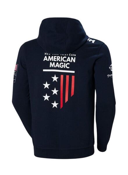 Suadera Helly Hansen. Modelo American Magic. Color azul marino. Capucha con cordones ajustables. Forro de la capucha estampado con estrellas. Extremos acanalados. Logos estampados en pecho, espalda y mangas. Detalles en rojo y blanco.