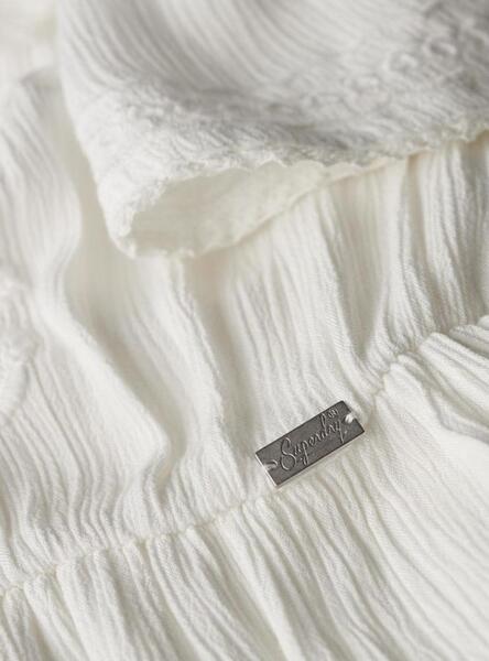 Vestido Superdry. Modelo Embroidered. Color blanco. Escote en V. Botones delanteros. Manga corta. Logo metalico en la cintura. Corte midi. Tejido ligero.