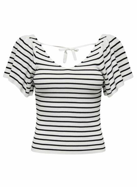 Camiseta Only. Modelo Leelo. Color blanco. Manga corta. Cuello amplio. Espalda abierta con cordón. Diseño a rayas.