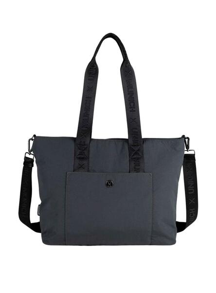 Bolso Munich. Modelo Bloom shopper. Color negro. Nylon suave. Tiradores personalizados en PU y cantos en contraste. Asas bandolera regulable adicional en nylon. Bolsillo frontal con cierre de imán escondido. Capacidad para portátil de 15,6 pulgadas. Interior con bolsillo con cremallera y dos compartimentos pequeños. Logo frontal.