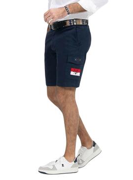 Bermuda El Pulpo. Modelo Patch Cargo. Color marino. Cierre de cremallera y botón. 4 bolsillos. 2 bolsillos cargo en los laterales. Trabillas para cinturón. Detalles bordados en uno de los bolsillos cargo. Regular fit.