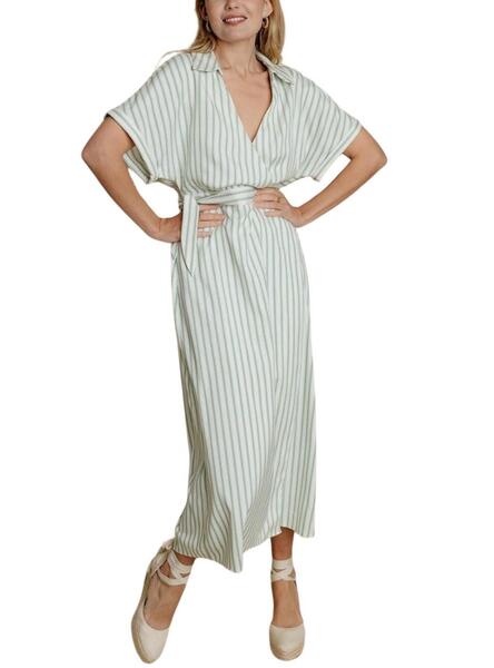 Vestido midi rayado mujer con cuello clásico y escote cruzado. Falda con solapa. De manga corta ancha caída. Atado con lazo en la cintura con posibilidad de ponerlo a un lado o atrás. Crudo