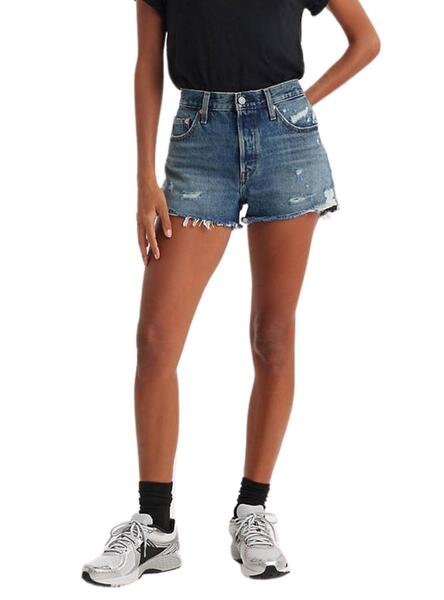 Short Levis. Modelo 501. Denim medio. Tiro alto. Cinco bolsillos. Efecto desgastado. Con rotos. Bajo deshilachado. Etiqueta en el bolsillo trasero. Parche de la marca en la cintura.