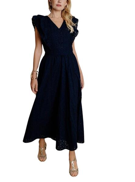 Vestido Naf Naf. Modelo Barbara. Color marino. Volantes en los hombros. Sin mangas. Cintura ajustada con goma. Cremallera lateral.